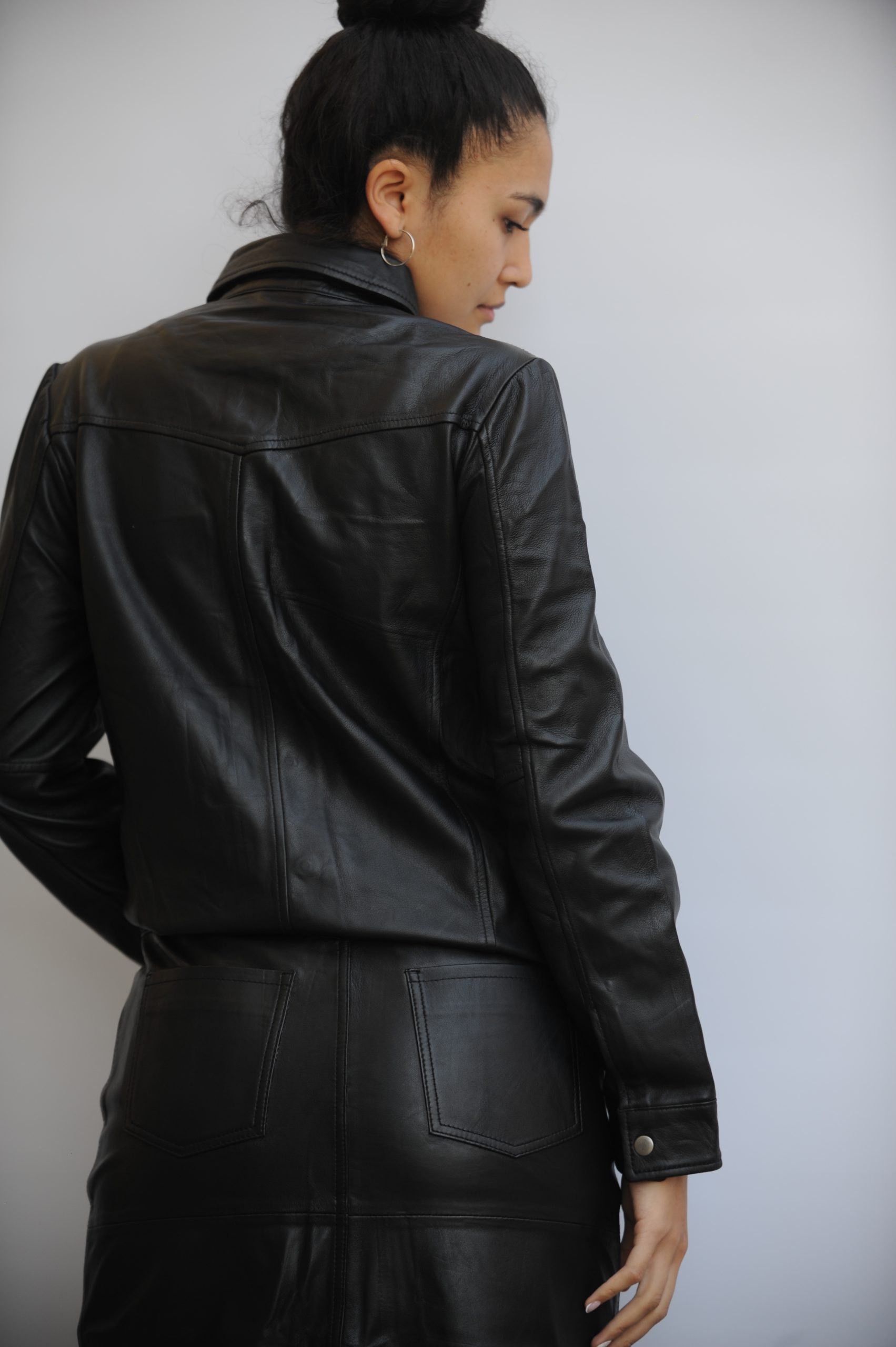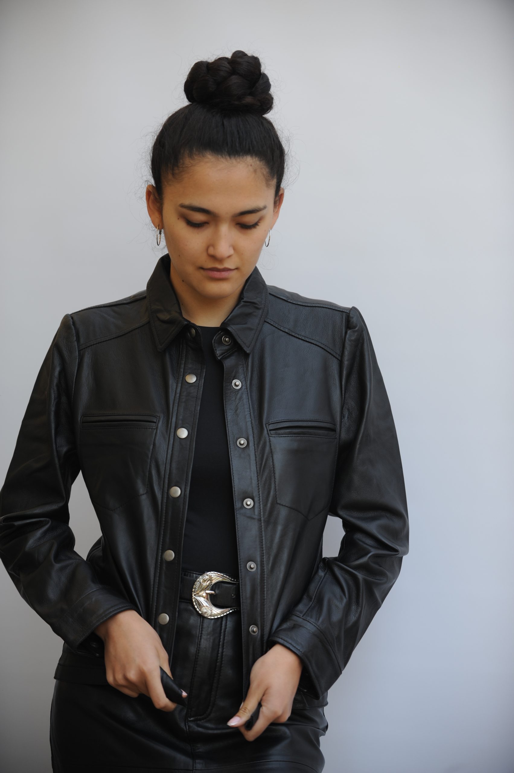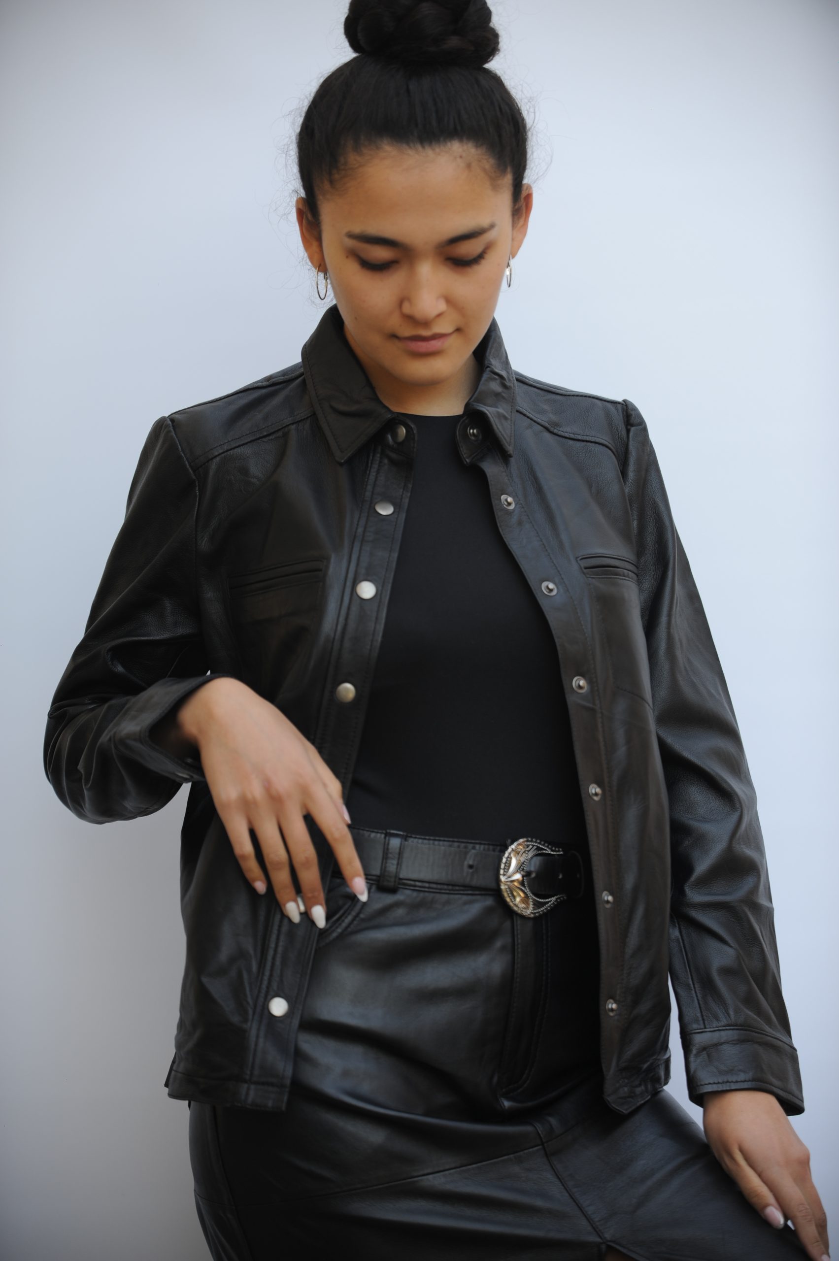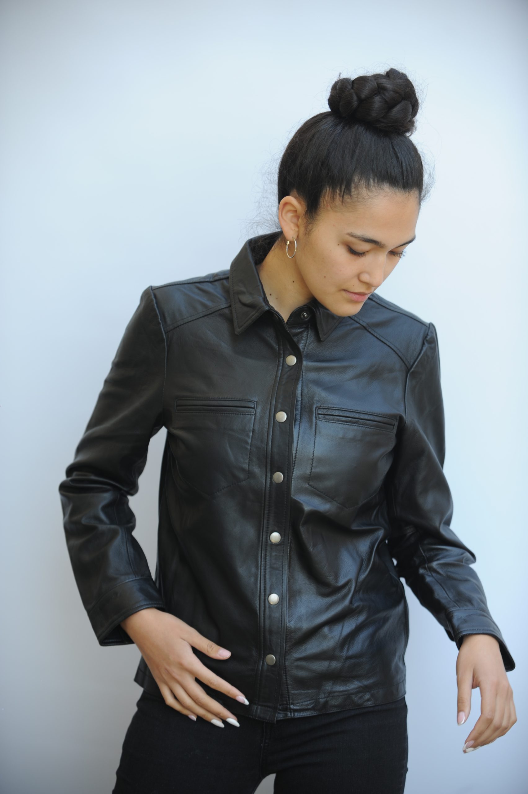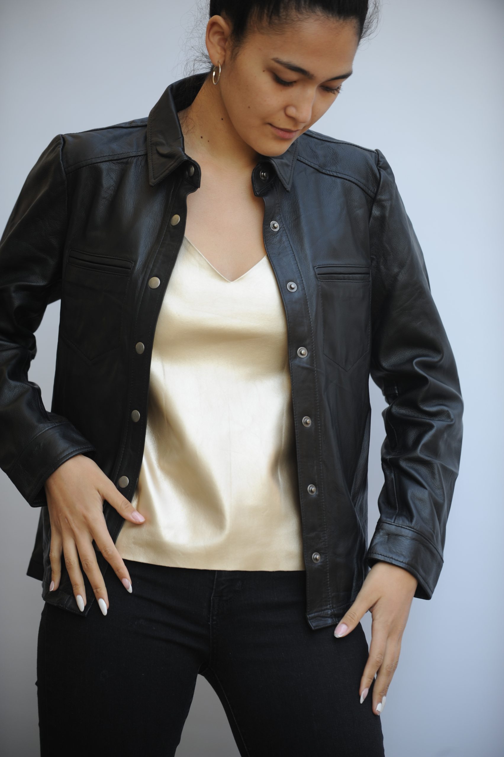 Camisa  Alberta,   esta hecha 100% cuero  de cabra,  femenina y delicada una prenda  versátil puede usar como blusa o sobre chaqueta.