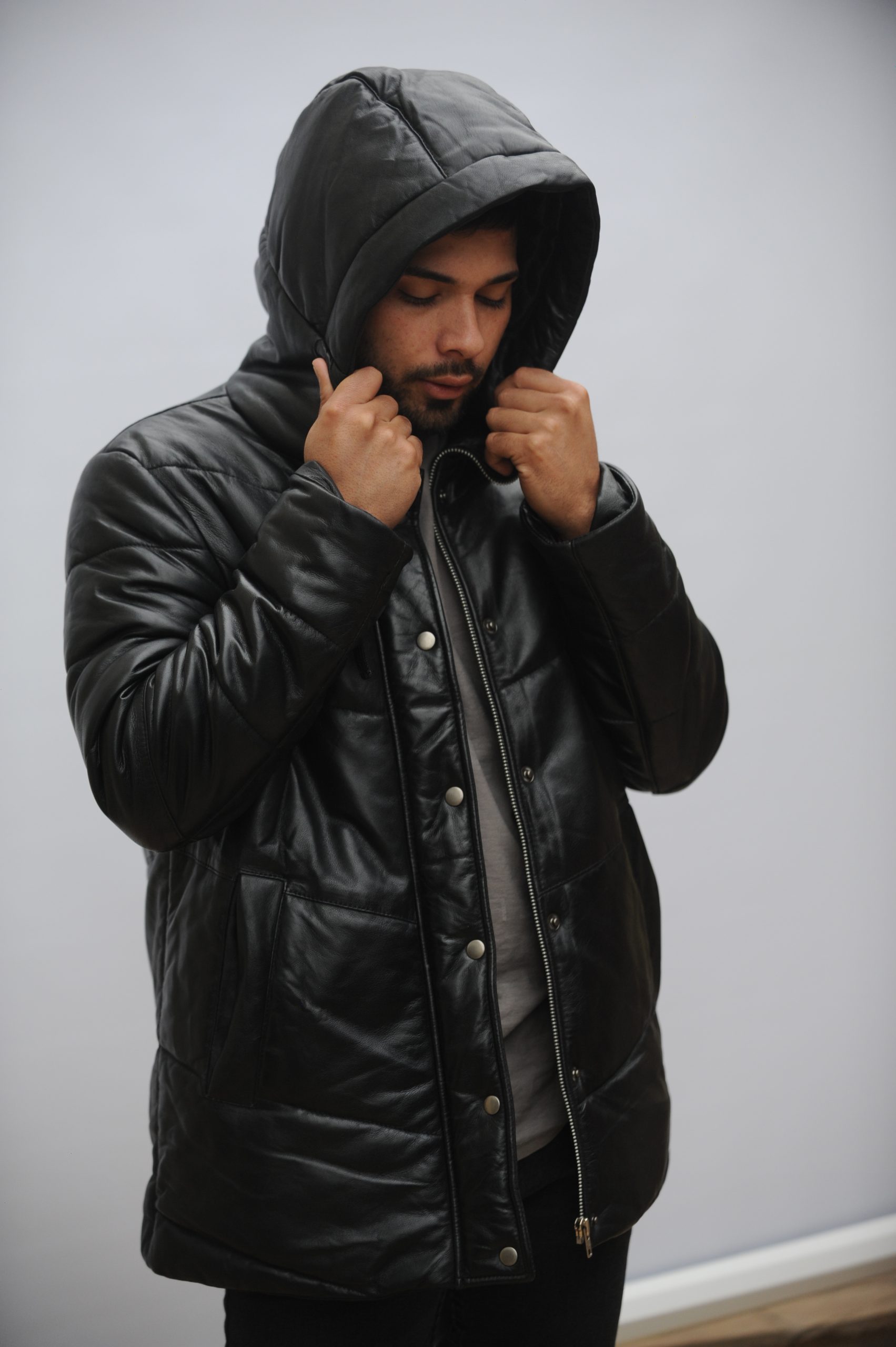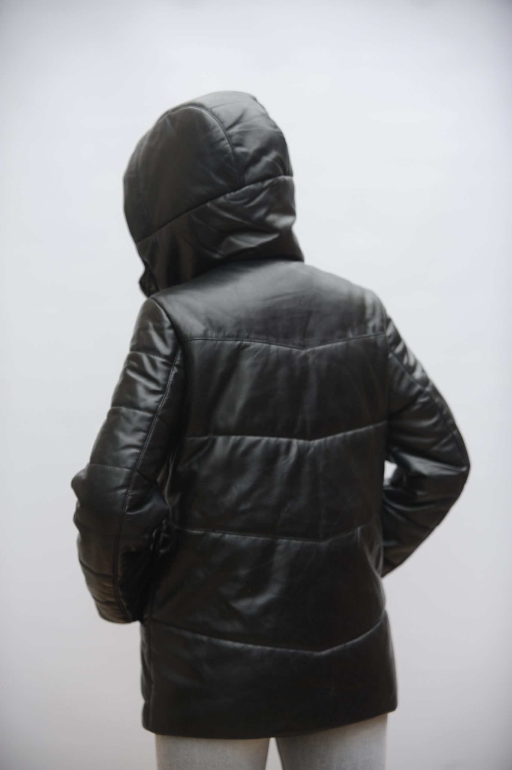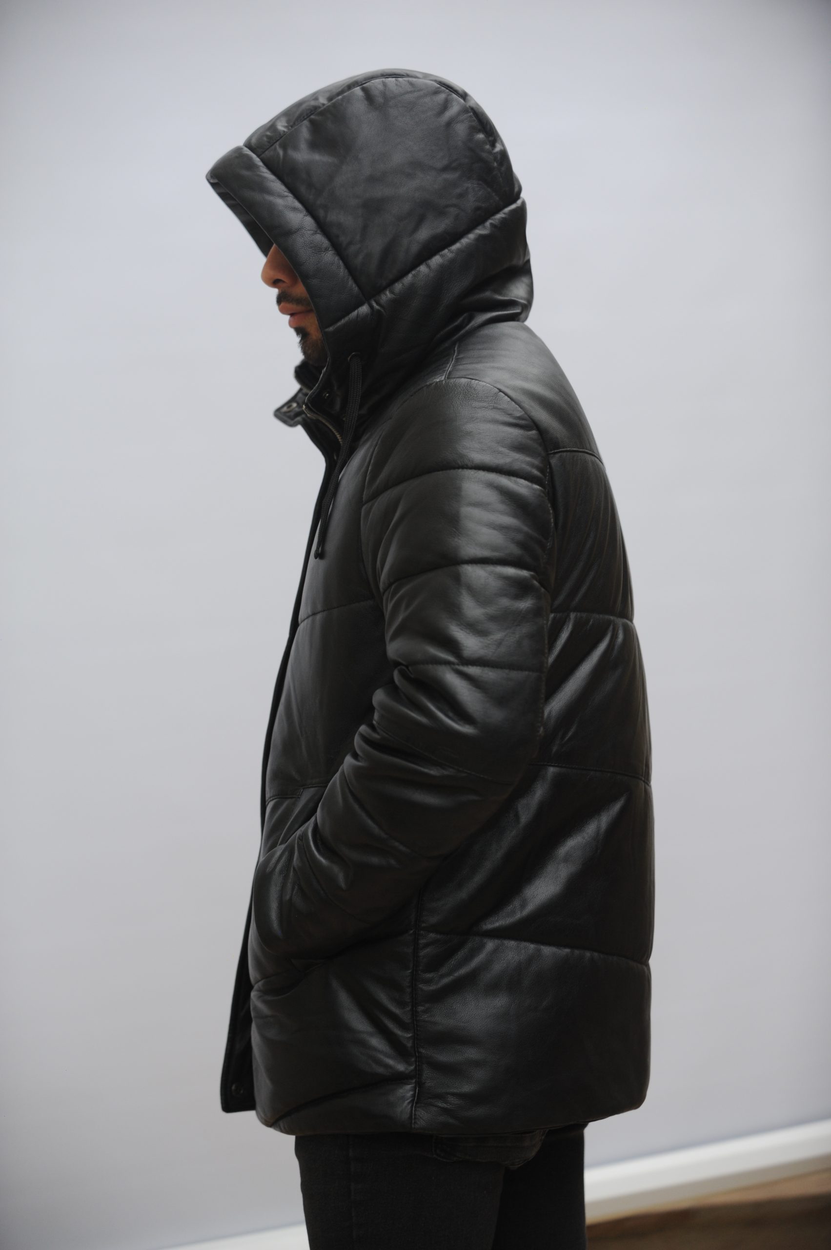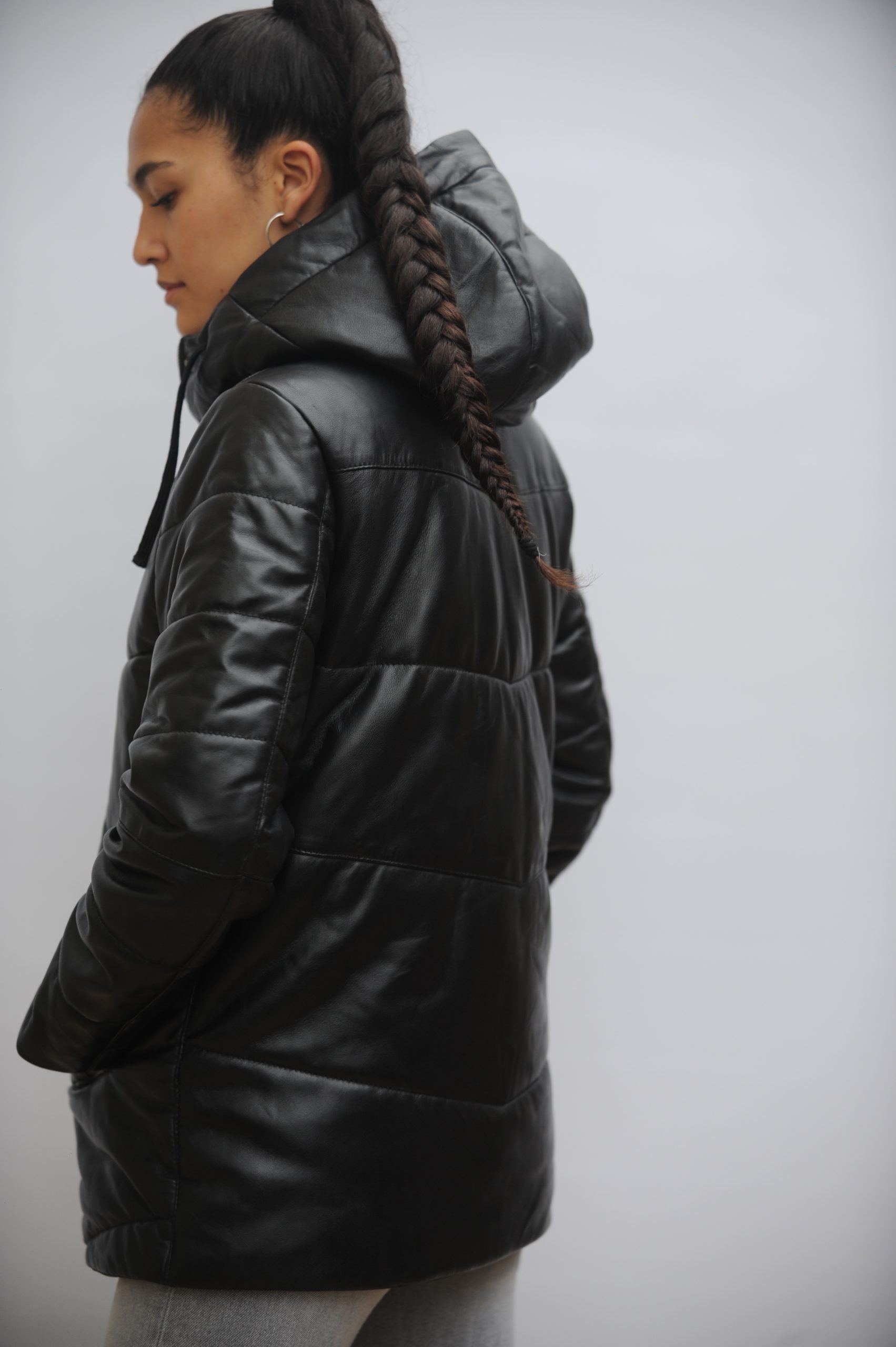 esta puffer está hecha en 100% cuero de cabra blando.